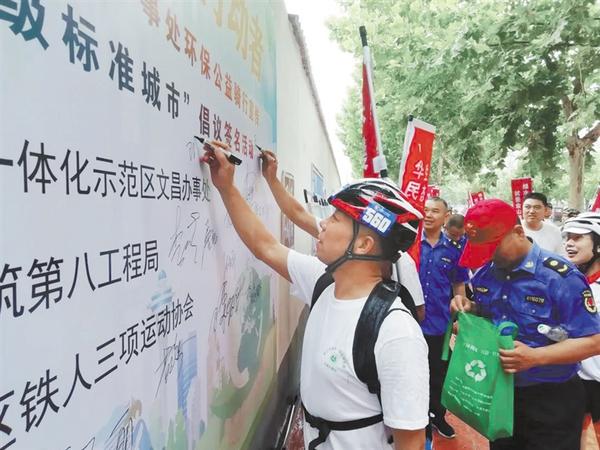 本报讯 (记者 张劲松 文/图) 6月9日,在市城乡一体化示范区环境治理精细化管理大队门前,120余名志愿者蓄势待发,“美丽周口 我是行动者”文昌办事处环保公益骑行宣传倡议签名活动正在这里举行。区管委会副主任张晓出席活动。区直相关责任单位、文昌办事处及中国建筑第八工程局的志愿者参加活动。