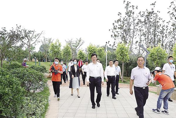 在项目规划、设计、建设的全过程中,县委书记林鸿嘉先后30多次现场办公,反复强调要把贾鲁河生态滨河公园项目作为全面贯彻"绿水青山就是金山银山”理念的生动实践,作为全面落实市委、市政府“中心城区大变化、县域经济大发展、干部作风大转变、生态环境大改善"四件大事要求的重要内容,作为全面推进国土绿化和森林城市建设的具体行动,坚持新发展理念和“精雕细琢、精益求精”,对整个项目亲自谋划、亲自设计、亲自督导、亲自指挥,现场帮助解决实际问题,大到项目总体规划、资金筹措,小到景观石摆放、树种选择、花草种植、灯光音乐和园内道路线型设计等,都按照高标准、高等级、高品位的美学要求精雕细琢、精心打磨,像一件艺术作品一样,着力打造成为了"五河五湖"工程的扛鼎之作、城市景观的经典之作、利民惠民的百年工程、县域发展的标志性工程。