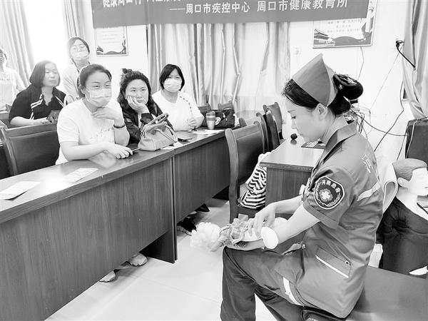 6月18日下午,由周口市卫健委、市疫控中心、周口市中心医院联合举办的“健康中原行 大医献爱心”健康教育扶贫活动在川汇区人和办事处举行。活动现场,周口市中心医院的专家团现场为市民进行健康知识讲座、急救知识演练、义诊、发放健康教育资料。 记者 孙安平 摄