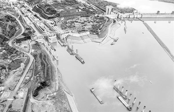 6月18日,船舶有序通过三峡五级船闸(无人机照片)。