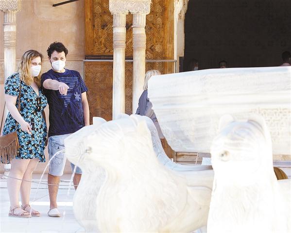 6月17日,游客在西班牙阿尔罕布拉宫内参观。当日,位于西班牙格拉纳达的阿尔罕布拉宫重新开门迎客。目前,景区每天最多接纳4500名游客,为以往的50%。新华社发