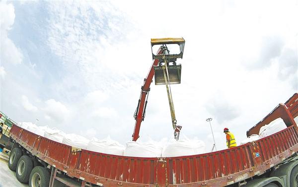 近日,吞吐量达千万吨的周口港口非常忙碌。运输工业用碱成为当前的主要货物,由周口本土生产的碱源源不断地在此卸车装船,运往下游的芜湖。记者 梁照曾 摄