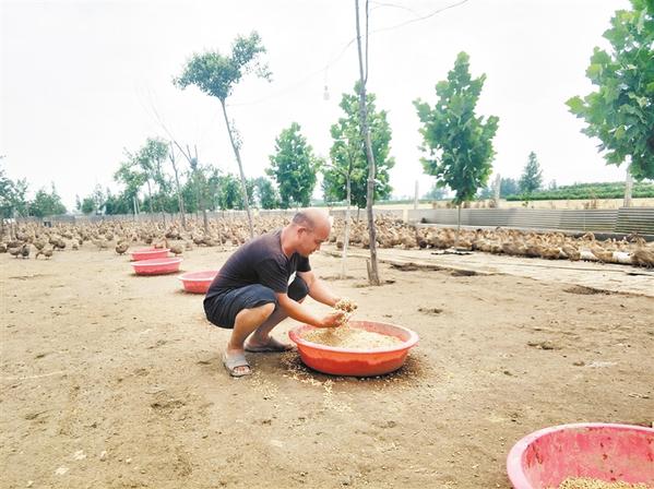 6月11日,沈丘县石槽集乡王湖村村民在专业养殖合作社内给鸭群喂食。近年来,该县大力引导农民发展特色产业,帮助农民稳定增收,为巩固提升脱贫成果打下坚实基础。