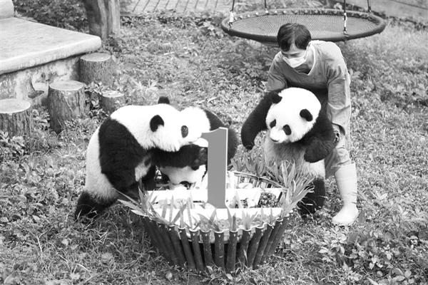 6月23日,饲养员怀抱大熊猫来到生日会现场。当日,重庆动物园为4只大熊猫“双双”“重重”“喜喜”“庆庆”举行周岁生日庆祝活动。4只大熊猫在重庆动物园熊猫馆运动场内玩耍嬉戏,享用市民游客为它们亲手制作的“生日蛋糕”。新华社发