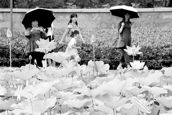 6月27日,游客在郑州紫荆山公园内观赏荷花。