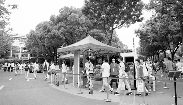 6月27日,在上海市闵行区莘松中学考点,考生依次通过测温门进入校园。
