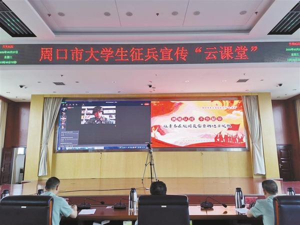 为了进一步激发大学生爱国情怀,强化国防意识,鼓励有责任、敢担当的高学历青年携笔从戎、投身强军伟业,5月27日,市征兵办公室着眼“疫情防控常态化”实际,通过“云课堂”钉钉直播开讲的方式,以“让青春在祖国最需要的地方绽放”为主题,把征兵与爱国相结合,把人生价值观融入国防教育中,面向周口三所高校在校大学生开展网上征兵宣传活动。课堂上,两名周口籍优秀军人——“双一等功臣”候国领、“神箭标兵”石闪闪通过现场视频连线,用自己投身军营的真实经历,为同学们上了一堂生动的国防教育课。在“现场答疑”环节中,大学生们积极提问,市征兵办工作人员认真解答,与大学生进行了在线隔屏交流,就大学生关注的征兵时间安排、直招士官与义务兵区别、参军服役年限等问题进行了深入解读。云课堂现场还播放了省征兵办公室制作的征兵动漫宣传片,向大学生讲解了大学生参军优待政策、参军入伍条件和程序等。“周口好兵”的典型引领、坦诚友好的交流,拉直了在场大学生心中的一个个问号,进一步激发了大学生投身军旅实现青春梦想的热情。同学们纷纷表示,青春不负迷彩色,人生不负从军行,一定要穿上军装到祖国最需要的地方建功立业、绽放青春。