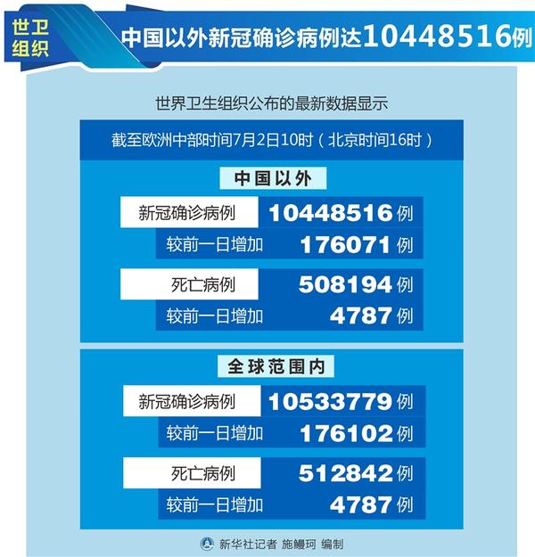 世卫组织:中国以外新冠确诊病例达10448516例