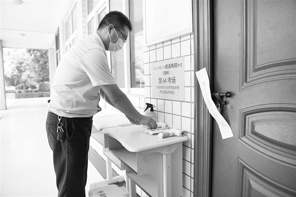7月6日上午,周口市文昌中学的工作人员在查看调试考场监控设备(大图)、摆放考场疫情防控物资(小图)。我市各考点准备工作已全部就绪。记者 王映 摄