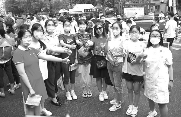 7月7日,考生在沈阳市第二十七中学考点外合影。