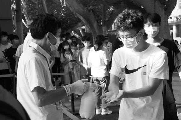 7月7日,在河南省郑州市八中考点,考生进入考场前进行消毒。