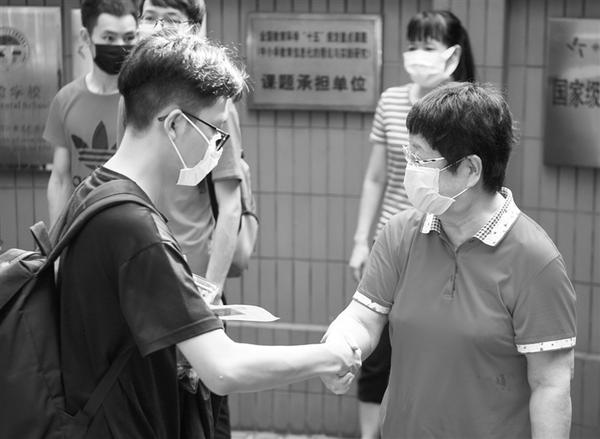 7月7日,在广州市培正中学考点外,送考老师(右)为考生加油鼓劲。
