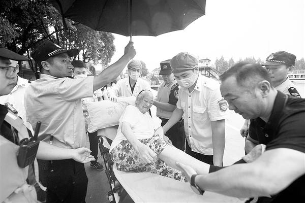 7月8日,应急人员将东洲街道五丰岛97岁瘫痪在床的董老太太撤离出来,安全转移到岸上。浙江省防指7月7日19时启动钱塘江流域防汛Ⅰ级应急响应,流域沿线开始紧急转移低洼地势地区群众。杭州市富阳区东洲街道紧急撤离五丰岛、新沙岛村民,经过一夜奋战,截至8日8时左右,两岛村民已基本转移完毕,正在进行最后收尾工作。新华社发