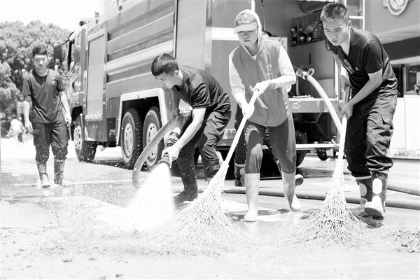 7月9日,安徽省歙县的消防人员和社区志愿者在灾后清理路面。