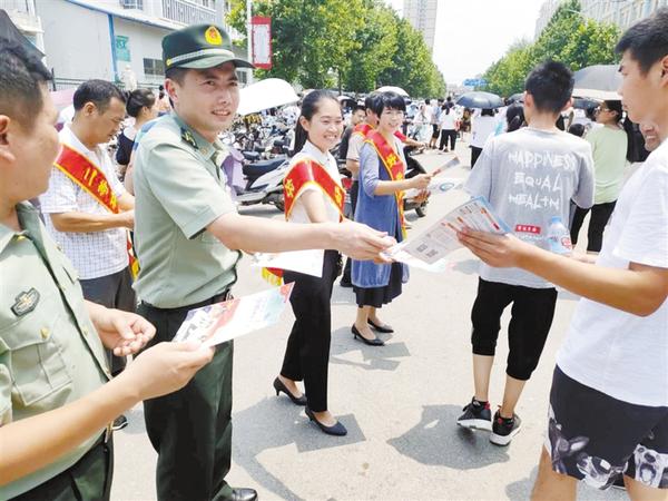 7月7日、7月8日,郸城县人武部创新征兵宣传方式,在高考考点附近设立征兵帐篷,请来二等功臣军属和“好兵妈妈”“好军嫂”助阵征兵宣传,现场讲述部队的故事,激发高考生参军入伍的积极性,为国家招纳优秀军队人才奠定了坚实基础。