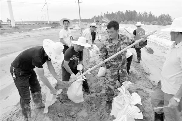 7月12日,江洲镇柳州村的村支书洪棉雪(前右二)和村民、支援人员一起装沙袋,加固堤坝。