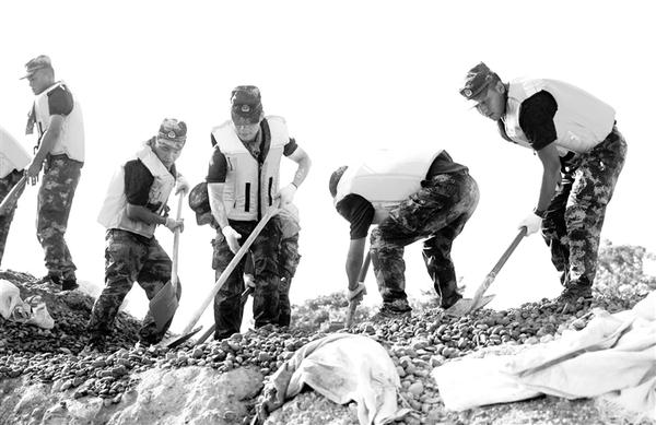 武警江西总队上饶支队的官兵在处置一处堤坝坍塌险情(7月14日摄)。