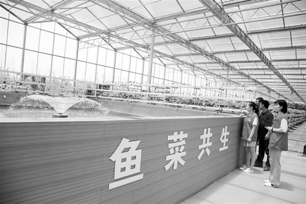 7月16日,在项城市丁集镇生态农业园的现代智能温室内,来自项城市新时代文明实践中心的农技科普志愿者正在给群众指导如何搞好鱼菜共生,为群众破解生产中的技术难点,努力助推当地群众增产增收。