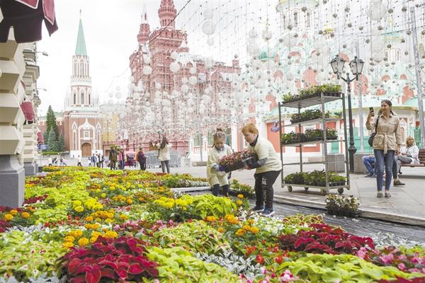 ① 7月15日,在俄罗斯首都莫斯科,孩子们将花卉摆放在古姆百货商场周围。俄罗斯莫斯科古姆百货商场花卉节当日开幕,本届花卉节将持续至8月25日。