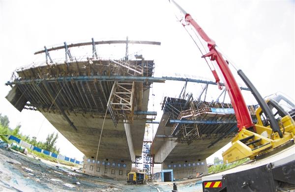 本报讯 (记者 梁照曾 文/图 ) 7月16日中午,记者在新建贾鲁河大桥项目工地看到,工人们冒着酷暑,在跨河的两列桥墩上,正在浇铸施工。目前,该项目已完成80%左右,预计年底桥体完成合龙。