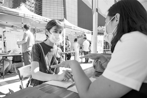 7月19日,求职者在招聘会现场与用人单位交流。