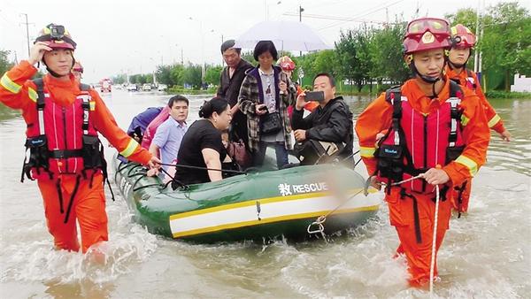 7月22日,我市普降大雨,淮阳区平安西路积水严重,导致20余辆轿车被困水中,消防人员接到报警后及时给予救援。记者 侯俊豫 通讯员 秦浩 摄