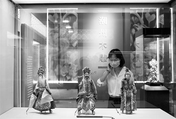 7月23日,一名参观者在北京中国国家博物馆观看展出的潮州铁枝木偶。