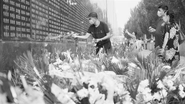 7月28日,市民在纪念墙前祭奠亲人。当日是唐山大地震44周年,许多市民来到唐山地震遗址纪念公园,在纪念墙前献上鲜花,祭奠遇难的亲人。 新华社发