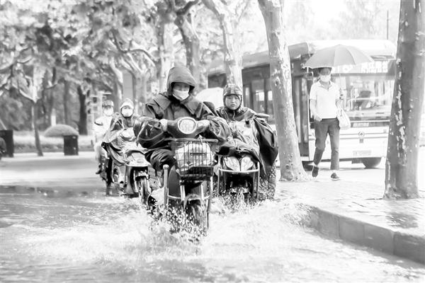 8月5日,在上海市,人们骑行经过一段积水路面。今年第4号台风“黑格比”8月4日夜间到5日上午影响上海,上海局部地区遭受超强降雨,积水最深的达120厘米,部分交通受到影响。上海全市防汛力量全力防御抢险,保障城市安全运行。新华社记者 王翔 摄