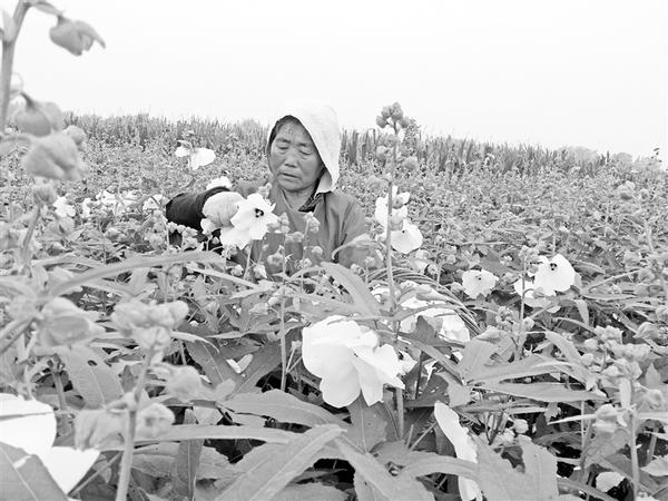 眼下,沈丘县卞路口乡高山店村200亩黄蜀葵进入采收旺季。