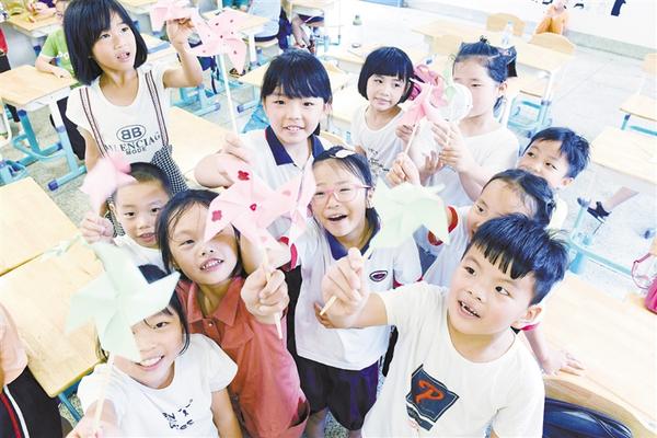 8月7日,孩子们在教室的风扇下让风车转动起来。