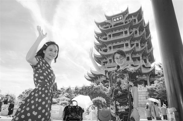 8月7日,受邀来湖北旅游的海南援鄂医疗队员陈小妹(左)与同事计超在黄鹤楼景区观光。