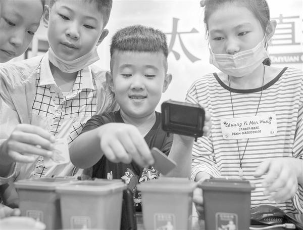 8月7日,小朋友们在太原市图书馆内模拟垃圾分类投放。