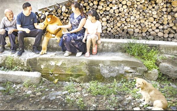 8月2日,下山“串门”的金丝猴与洋县茅坪镇茅坪村村民在一起。