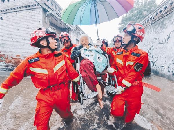 8月6日,山东聊城遭遇暴雨袭击,高唐县和阳谷县城区多处积水,积水最深处达1.4米,部分居民被困家中。在聊城市阳谷县,消防队员将老人转移至安全地带(手机照片)。
