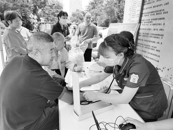 8月9日上午,文昌社区卫生服务中心的工作人员在建业小区为居民服务。文昌社区卫生服务中心为了更好为辖区居民及常住居民服务,经常到各小区内为居民免费测血压、血糖,发放各种健康教育资料,宣传国家基本公共卫生服务项目,提高居民知晓率,增强居民满意度,深受居民欢迎。记者 孙安平 摄