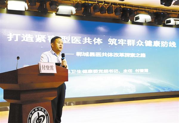 本报讯 (记者 徐松 通讯员 刘志刚 张洋 文/图) 7月30日、31日,来自我省开封市、南阳市新野县、新密市、平顶山市和洛阳市偃师市,以及山东省莘县、湖北省阳新县三省7个市县的医共体建设考察团共200余人到郸城县实地观摩考察医共体建设。河南省卫健委体改处副处长江行义出席会议并作政策解读,郸城县副县长张凯致辞,郸城县卫健委党组书记、主任付登霄分享医共体建设“郸城经验”(如图)。