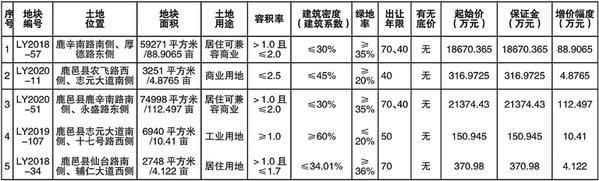 七、挂牌时间及网址 挂牌报价时间为:LY2018-57地块:2020年9月4日9时至2020年9月16日15时。LY2020-11地块:2020年9月4日9时至2020年9月16日15时10分。LY2020-51地块:2020年9月4日9时至2020年9月16日15时20分。LY2019-107地块:2020年9月4日9时至2020年9月16日15时30分。LY2018-34地块:2020年9月4日9时至2020年9月16日15时40分。挂牌网址:鹿邑县公共资源交易平台(http://www.lyggzyjy.org.cn/)。