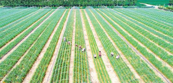 8月18日,扶沟县绿久扶贫基地的贫困群众正在为韭菜除草,空中俯瞰如跳动的音符。该扶贫基地占地300亩,解决80多名剩余劳动力就业,仅贫困群众达到30多名。扶贫基地带动了当地经济的发展,促进了贫困群众增收。 谷志方 李永超 摄