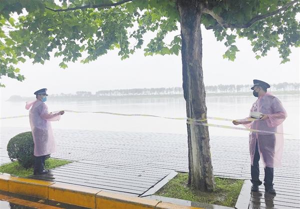 8月27日,在辽宁省丹东市,丹东边境管理支队民警在鸭绿江边拉起警戒带。记者从中央气象台获悉,今年第8号台风“巴威”的中心已于27日上午8时30分前后在中朝交界附近的朝鲜平安北道沿海登陆,登陆时中心附近最大风力有12级(35米/秒),中心最低气压为970百帕。中央气象台8月27日继续发布台风红色预警。新华社发