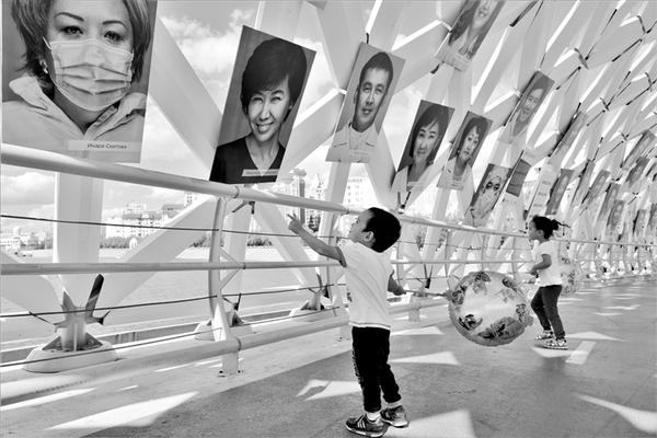 8月27日,两名儿童在哈萨克斯坦首都努尔苏丹观看以抗击新冠疫情为主题的摄影作品。