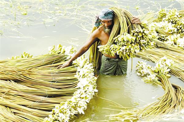 睡莲是孟加拉国的国花,不仅花开美丽,也是当地的特色食材,目前正值采摘季节。新华社发