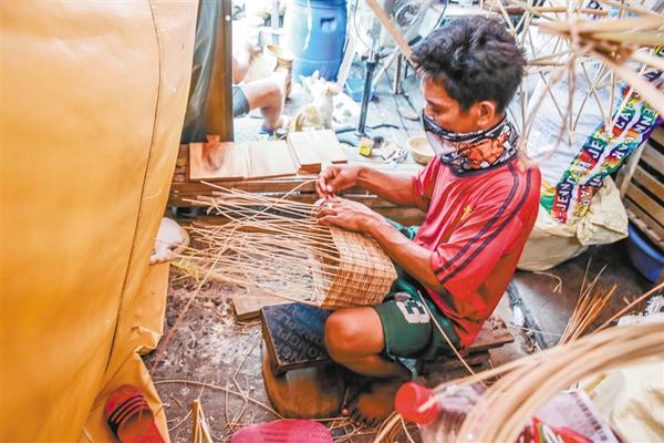 8月29日,在菲律宾首都马尼拉的手工艺品摊位上,手工业者佩戴口罩编制手工艺制品。
