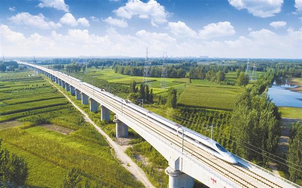 9月1日,一列飞驰而过的高速动车和丰收在望的秋粮作物、郁郁葱葱的树林构成了一幅美丽的图画。