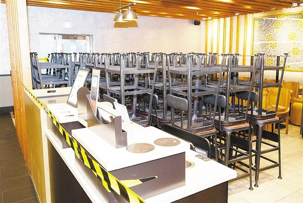 图① 9月2日,在韩国首尔,一家星巴克的桌椅被集中堆放。据韩国中央防疫对策本部1日通报,当地时间8月31日零时至9月1日零时,韩国新增新冠确诊病例235例,累计确诊20182例。新华社发
