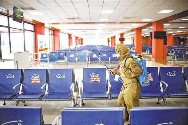 图③ 9月2日,一名工作人员在尼泊尔加德满都特里布万国际机场内喷洒消毒液。受疫情影响,尼泊尔于3月下旬暂停国际、国内商业客运航班服务。9月1日,尼泊尔开始有限恢复国际商业航班客运服务,允许特定国家和地区的特定人群入境,但暂时不允许游客入境。新华社发