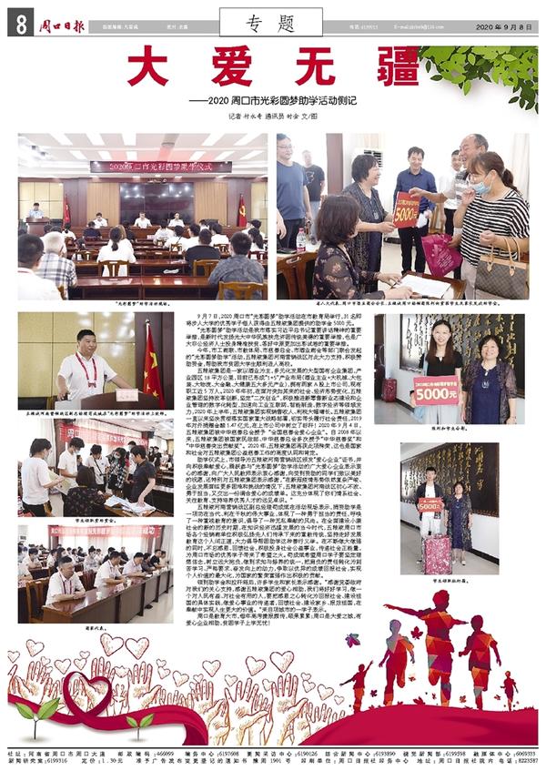 9月7日,2020周口市“光彩圆梦”助学活动在市教育局举行,31名即将步入大学的优秀学子每人获得由五粮液集团提供的助学金5000元。