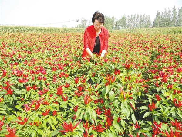 9月13日,商水县巴村镇双楼田村的椒农正在田间摘辣椒。该镇积极调整农业种植结构,引导群众发展特色种植,增加经济收入。目前,全镇已发展朝天椒1000多亩、金银花1000多亩。