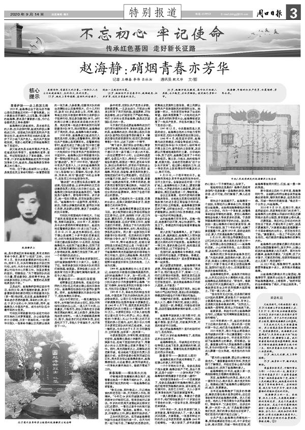 赵海静烈士的一生,虽短暂,但无上光荣。无数像赵海静一样的英雄先烈,是这个民族最闪亮的坐标,是这个时代最鲜艳的旗帜!赵海静烈士不畏艰难、不怕牺牲,舍己为人、视死如归的革命精神,必将永远激励无数青年人,在英雄辈出的新时代奋勇拼搏、争做先锋。①2
