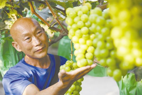 今年夏季由于雨水较多,葡萄甜度下降。为增加葡萄甜度,全国科普惠农先进工作者、河南省优秀科技特派员、商水县农业科技入户首席专家刘启山深入全县各地指导种植户通过增施农家肥、覆盖透明薄膜、使用绿色套袋等措施,改良土壤、提升棚内温度、改善果实品质,确保葡萄的甜度和口感。这些被科技“武装”起来的葡萄色味俱佳,价格是普通葡萄的几倍,增加了种植户的生产效益。图为9月9日商水县农业专家刘启山在绿苑葡萄园内查看葡萄生长情况。
